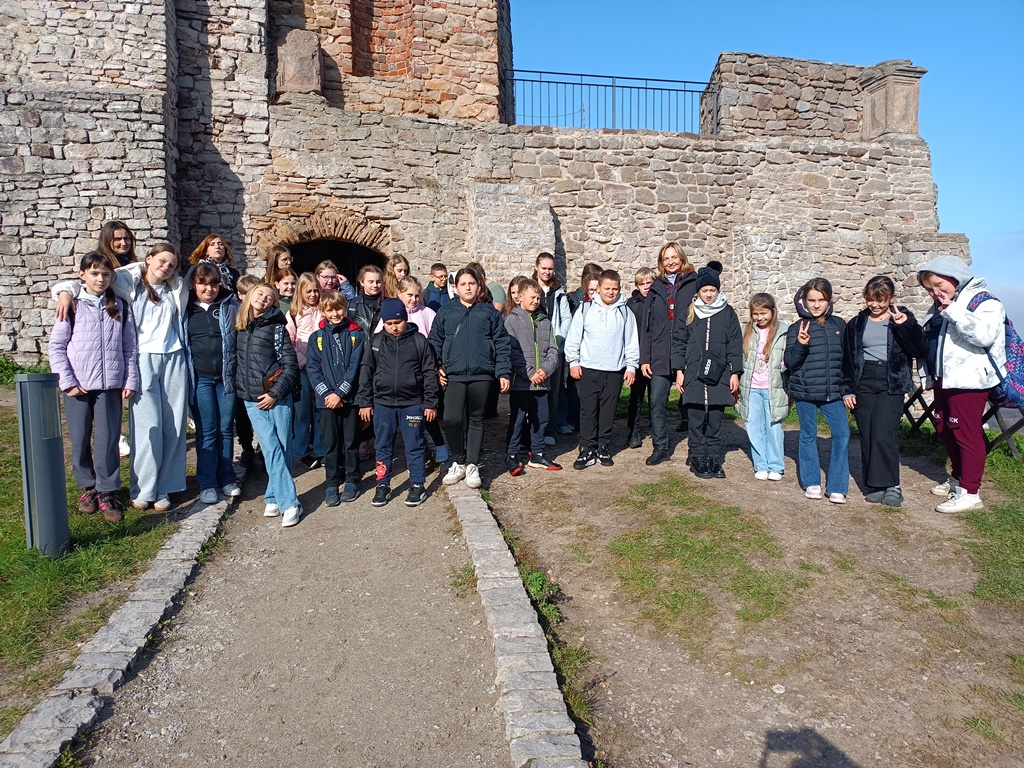 W dn. 08. 10. 2025 r. uczniowie klas IV – VI wraz z opiekunami wybrali się na wycieczkę w Góry Świętokrzyskie. Ten dzień pełen wrażeń rozpoczęli od zwiedzania, tonących w jesiennych mgłach, ruin zamku królewskiego w Chęcinach, gdzie wspięli się na wieżę obronną, zwiedzili skarbiec i salę tortur oraz mieli okazję przymierzyć rycerskie zbroje. Kolejnym