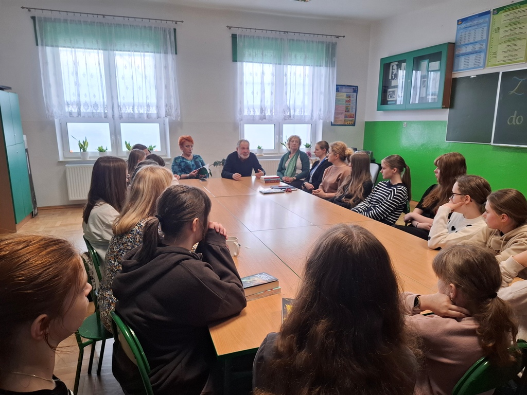 We wtorek 14 kwietnia 2026 r. odbyło się kolejne spotkanie czytelnicze zorganizowane przez bibliotekę szkolną. Gościem specjalnym był pan Ireneusz Janas – emerytowany nauczyciel historii i geografii naszej szkoły. W spotkaniu wzięli także udział uczniowie i nauczyciele z panią dyrektor Dorotą Sońską-Jagusztyn. Wszyscy z niecierpliwością czekali na okazję do tego, aby porozmawiać na temat czytanych,
