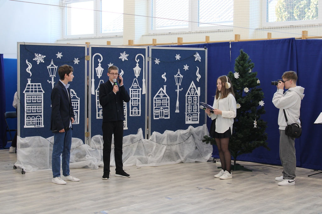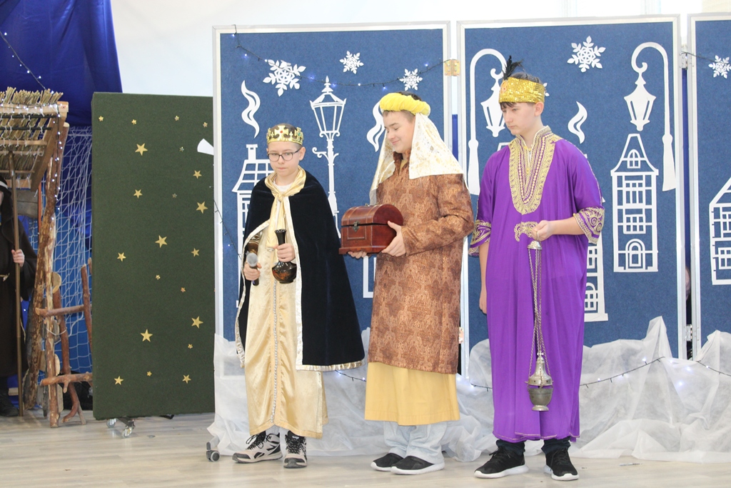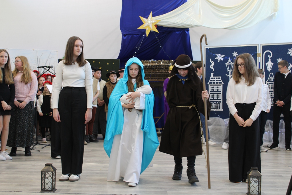 Uczniowie klasy VI i VIII przygotowali okolicznościowe przedstawienie pt. „Wigilijna ulica”. Jego myślą przewodnią była próba odpowiedzi na pytanie, czym dla współczesnego człowieka są święta, a także chęć zrozumienia celu przyjścia na świat Boga – Człowieka. Gra aktorska młodzieży i piękne śpiewy chóru szkolnego wprowadziły zgromadzonych w radosny, świąteczny nastrój i zostały nagrodzone gromkimi brawami.