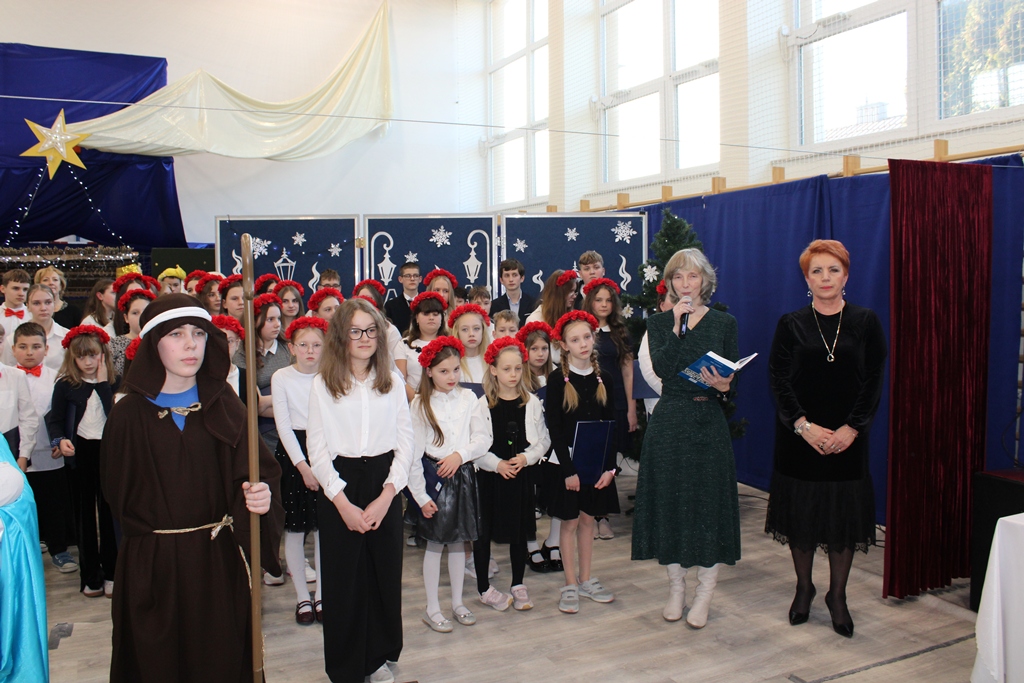Następnie głos zabrała Pani Dorota Sońska – Jagusztyn, Dyrektor Szkoły, dziękując uczniom za występ i składając wszystkim świąteczne życzenia. Na koniec uroczystości, cała społeczność szkolna wraz z przybyłymi gośćmi przełamała się symbolicznie opłatkiem.
