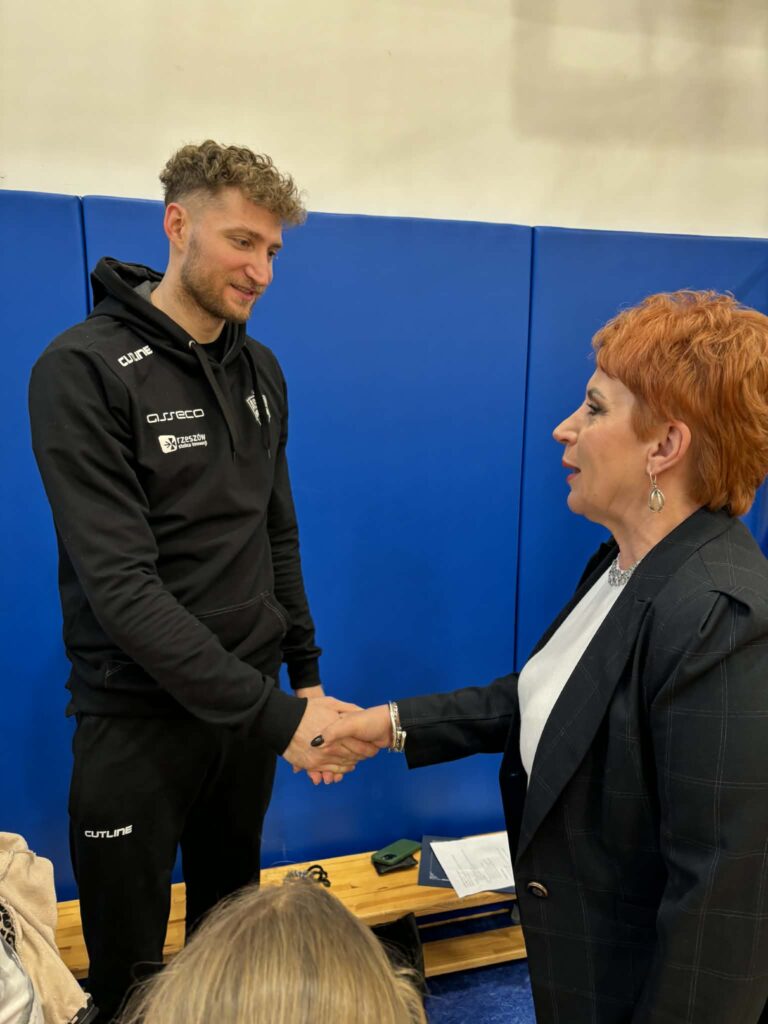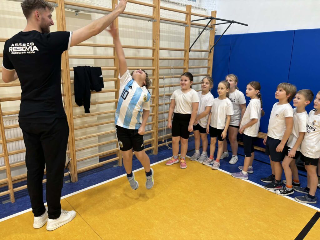 3 grudnia 2025 r. w naszej szkole odbyły się wyjątkowe zajęcia wychowania fizycznego dla uczniów klas 1 i 2, zorganizowane w ramach projektów „Akademia Małych Zdobywców” oraz „Mały Mistrz”. Są to programy ogólnopolskie zachęcające najmłodszych uczniów do zdobywania nowych umiejętności ruchowych oraz podnoszenia sprawności fizycznej. Specjalnym gościem lekcji był zawodnik Asseco Resovii- pan Dawid Woch, który poprowadził sportowe warsztaty oraz zaprezentował podstawowe elementy siatkówki.
