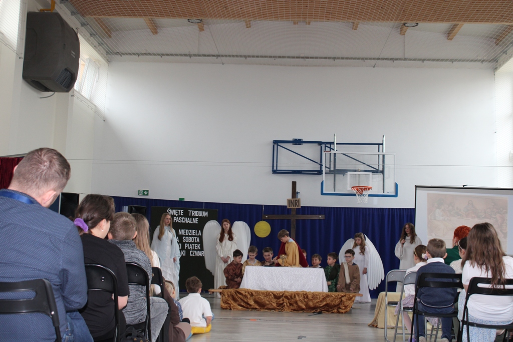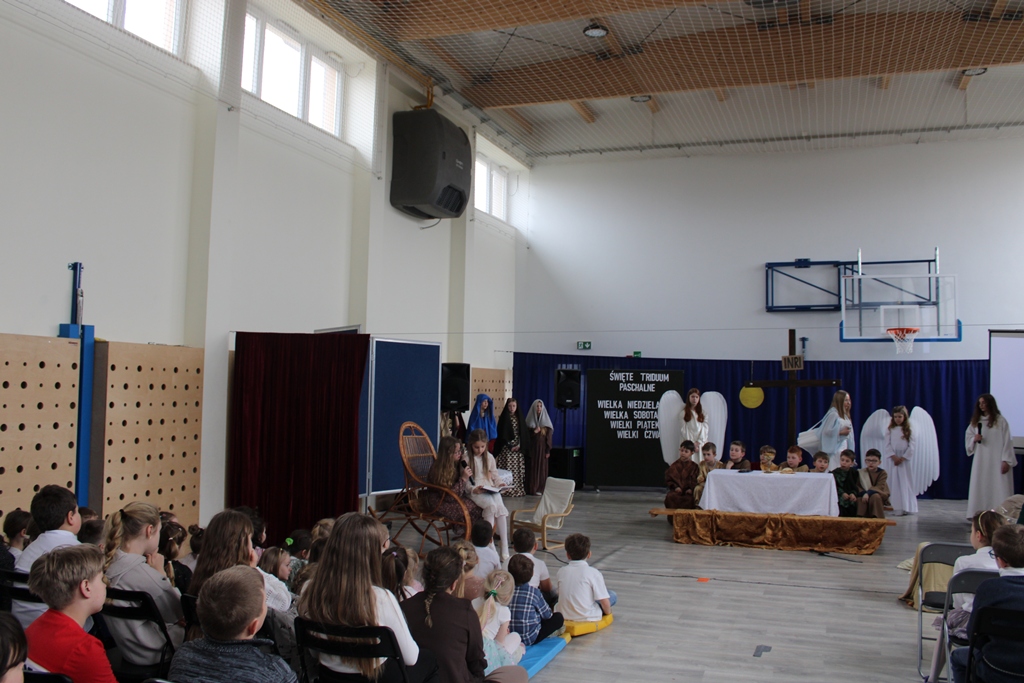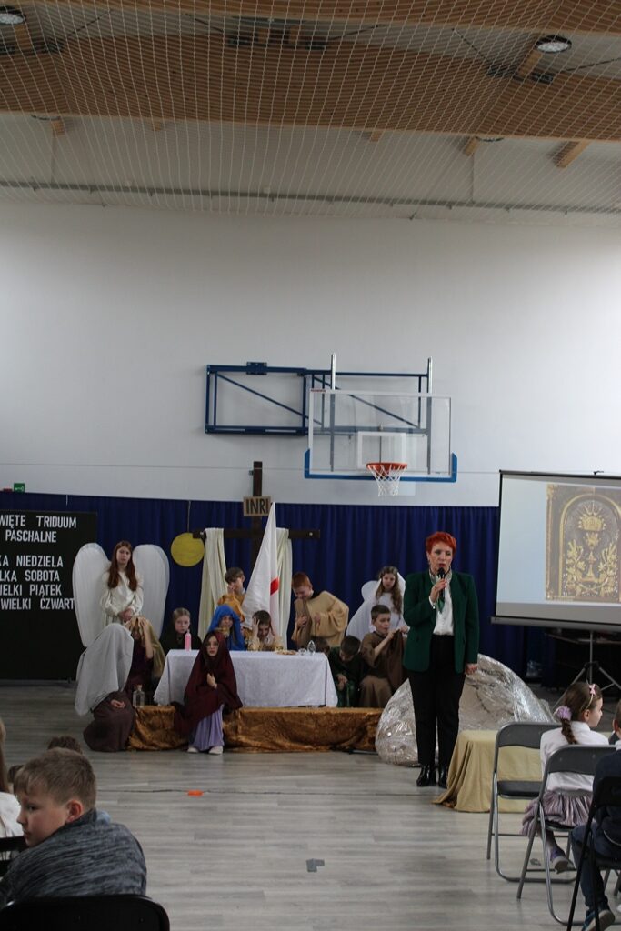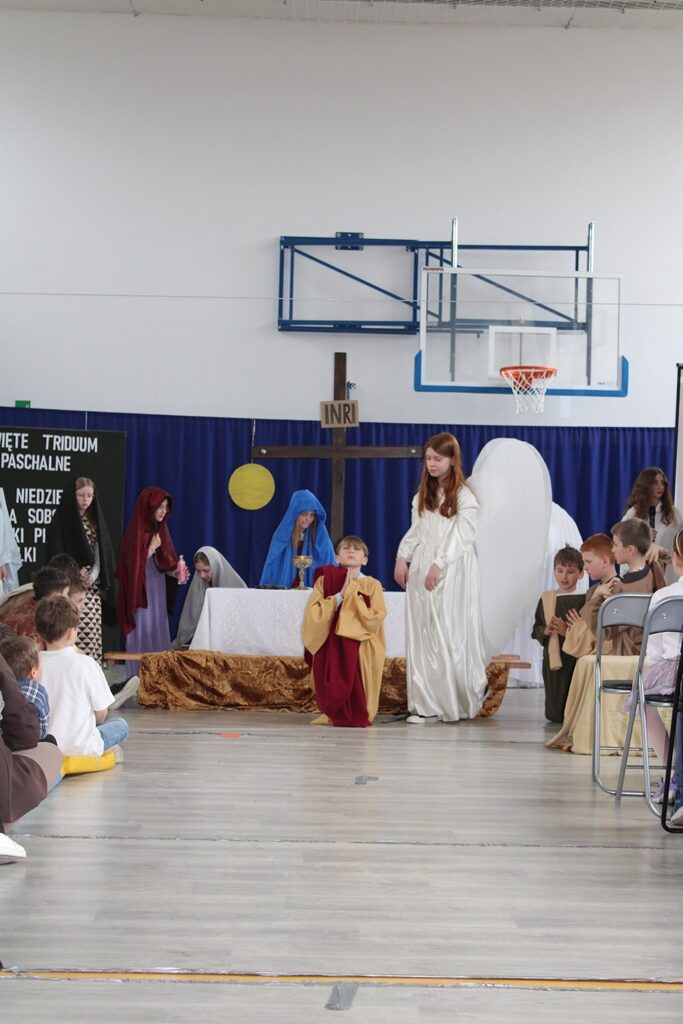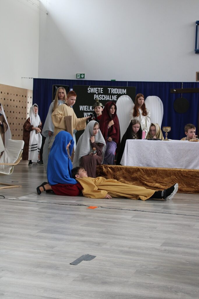 31.03.2026 r. w naszej szkole odbyła się premiera wyjątkowej opowieści „Święte Triduum Paschalne”. To niezwykłe wydarzenie pozwoliło nam wspólnie przeżyć i lepiej zrozumieć najważniejsze dni w roku liturgicznym – od Wielkiego Czwartku aż po radosne Zmartwychwstanie Pana Jezusa. Uczniowie w piękny i poruszający sposób ukazali historię, liturgię oraz tradycje związane z tym świętym czasem. Młodzi aktorzy wcielili się w wiele ról, tworząc niezapomnianą atmosferę refleksji i zadumy.