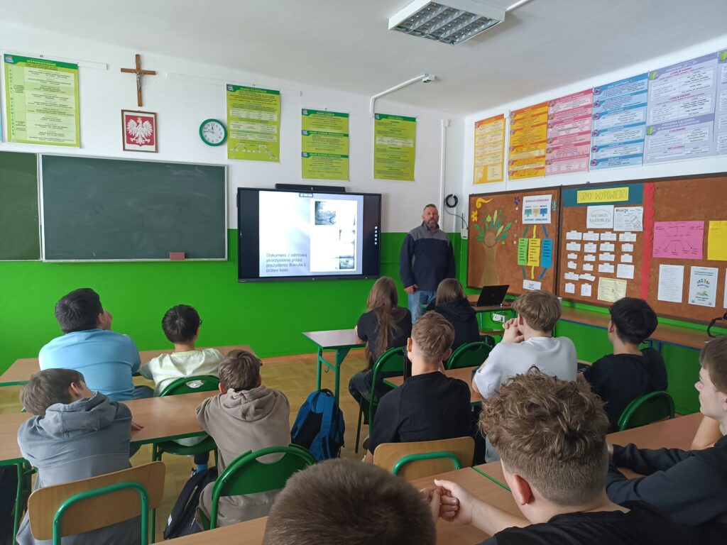 3 lutego 2026 r. uczniowie naszej szkoły uczestniczyli w trzech prelekcjach pana Macieja Rędziniaka, pracownika rzeszowskiego oddziału IPN. Klasy młodsze (I-III) poznały historię naszych symboli narodowych. („Symbole naszej historii – historia herbu i flagi Polski”). Wiedzą teraz, jaka jest historia polskiego herbu, flagi i hymnu. Potrafią też zachować właściwą postawę podczas śpiewania Mazurka Dąbrowskiego. Starsze klasy (IV-VI) zostały zapoznane z losami dzieci i młodzieży w okresie II wojny światowej („Najmłodsi bohaterowie – dzieci i młodzież podczas II wojny światowej”). Uczniowie w ogromnym skupieniu wysłuchali opowieści o swoich rówieśnikach, którzy trafiając w obce miejsca poznali trud pracy i głodu. Klasy VII i VIII zostały zapoznane z wyjątkową postacią Rotmistrza Witolda Pileckiego. Wszystkie wykłady były bogato ilustrowane filmami i zdjęciami oraz relacjami świadków wydarzeń omawianych okresów. Na koniec prowadzący poinformował uczniów o ogłoszonym przez IPN międzynarodowym konkursie pt. „Niedźwiedź Wojtek – żołnierz gen. Andersa”