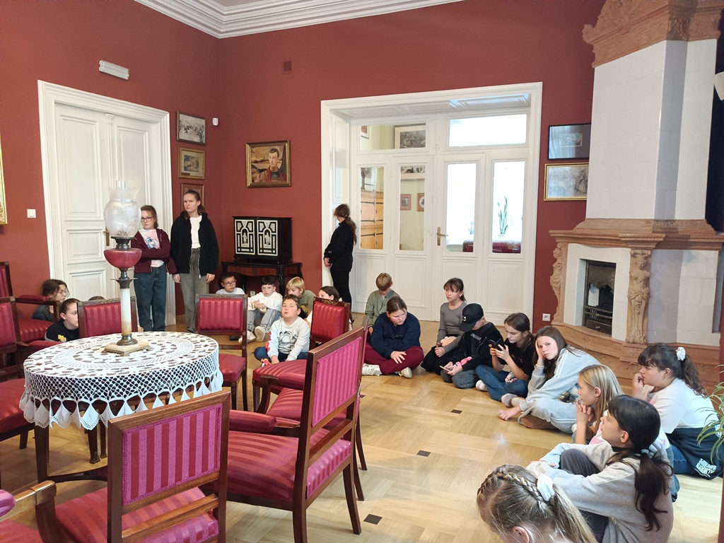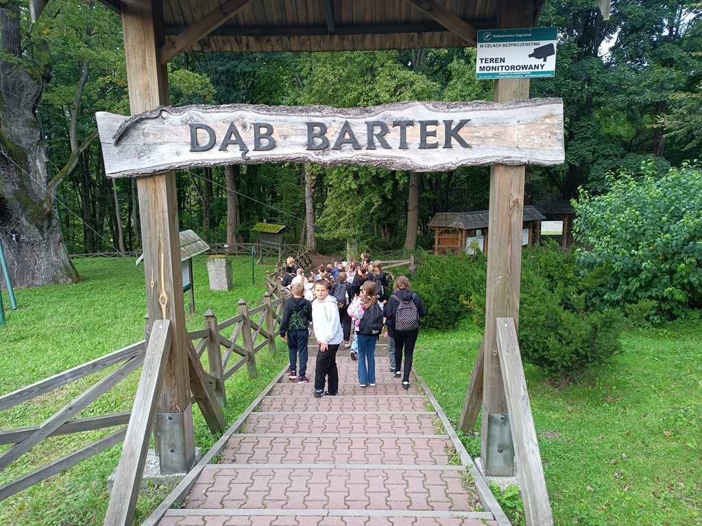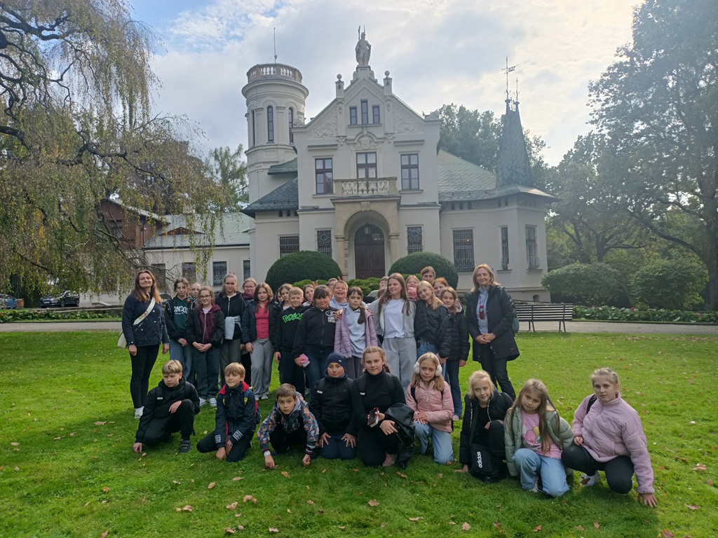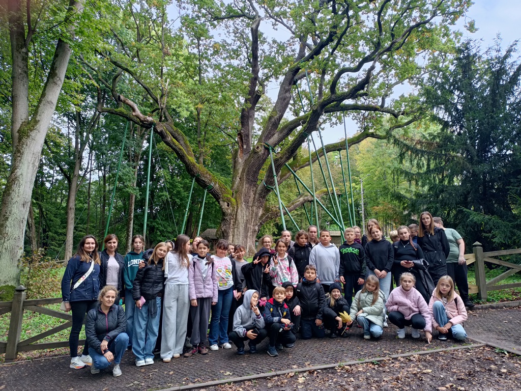 W dn. 08. 10. 2025 r. uczniowie klas IV – VI wraz z opiekunami wybrali się na wycieczkę w Góry Świętokrzyskie. Ten dzień pełen wrażeń rozpoczęli od zwiedzania, tonących w jesiennych mgłach, ruin zamku królewskiego w Chęcinach, gdzie wspięli się na wieżę obronną, zwiedzili skarbiec i salę tortur oraz mieli okazję przymierzyć rycerskie zbroje. Kolejnym punktem programu były odwiedziny w Centrum Nauki Leonarda da Vinci, w którym dzieci poznawały niezwykłe tajemnice ludzkiego ciała i jego możliwości w postaci arcyciekawych doświadczeń. Następnie przejechali do Muzeum Henryka Sienkiewicza w Oblęgorku, który zachwycał urokliwym położeniem oraz klimatycznymi wnętrzami i cennymi pamiątkami po pierwszym polskim nobliście z dziedziny literatury. Na koniec wszyscy udali się na spotkanie z jednym z najstarszych drzew w Polsce – sędziwym i dostojnym dębem Bartkiem w Zagnańsku.